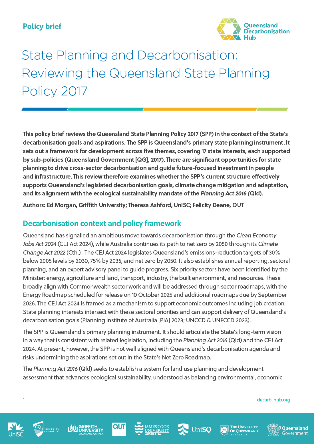 This policy brief reviews the Queensland State Planning Policy 2017 (SPP) in the context of the State’s decarbonisation goals and aspirations. The SPP is Queensland’s primary state planning instrument. It sets out a framework for development across five themes, covering 17 state interests, each supported by sub-policies. There are significant opportunities for state planning to drive cross-sector decarbonisation and guide future-focused investment in people and infrastructure. This review therefore examines whether the SPP’s current structure effectively supports Queensland’s legislated decarbonisation goals, climate change mitigation and adaptation, and its alignment with the ecological sustainability mandate of the Planning Act 2016 (Qld).